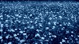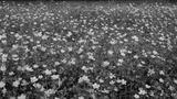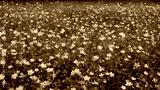 a field filled with yellow flowers and green grass on top of a wooden bench