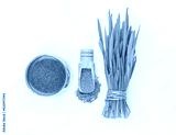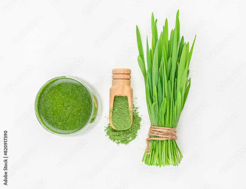 Fresh wheat grass and powder on white background, Healthy drink with organic green smoothie, Detox superfood.