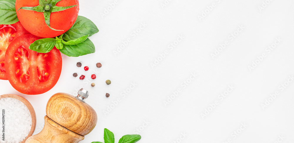 Composition with ingredients for cooking on table on a white background top view. copy space
