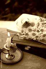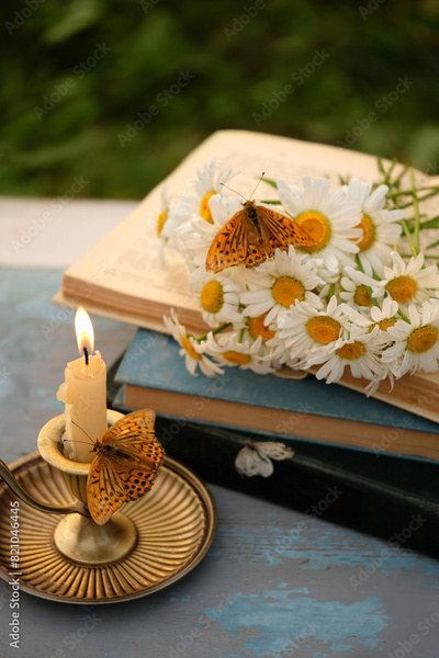 burning candle, butterflies, old books and chamomile flowers on table in garden. close up. relax, reading time. romantic inspiration composition.