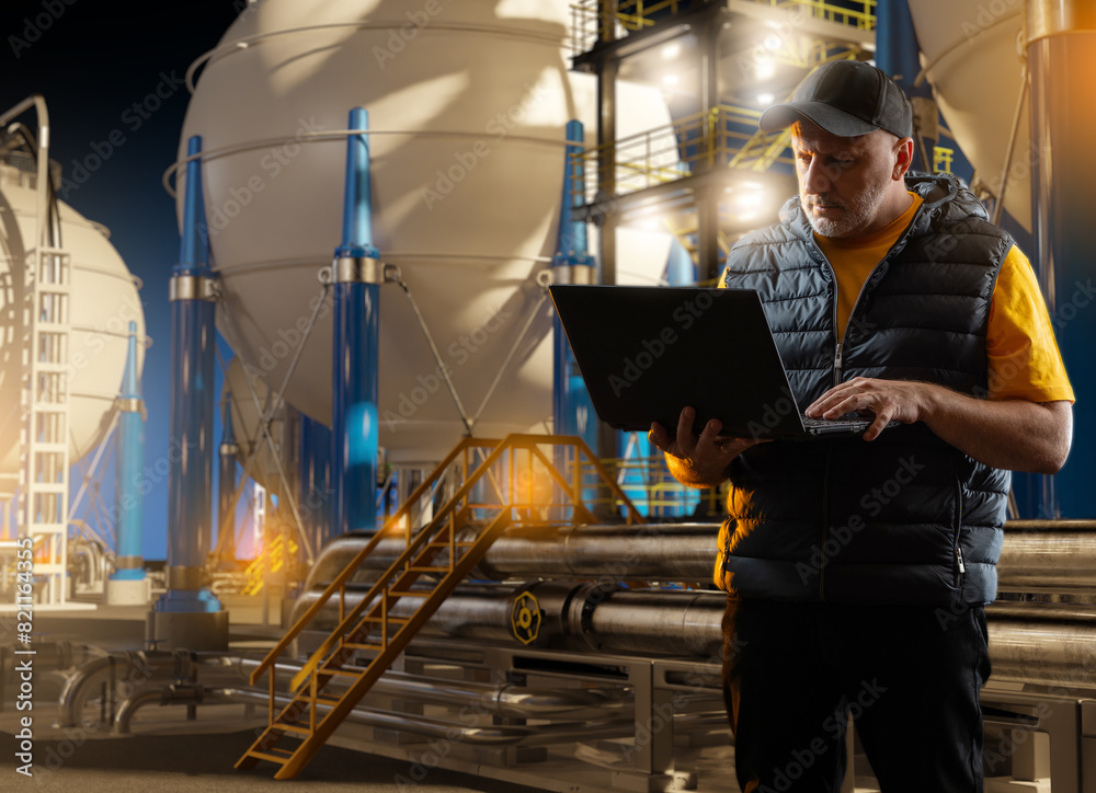 Man owner of factory. Manufactory contractor with laptop. Chemical factory employee. Man on territory of evening plant. Technologist guy at work. Factory owner near industrial structures. BPVC, ASME