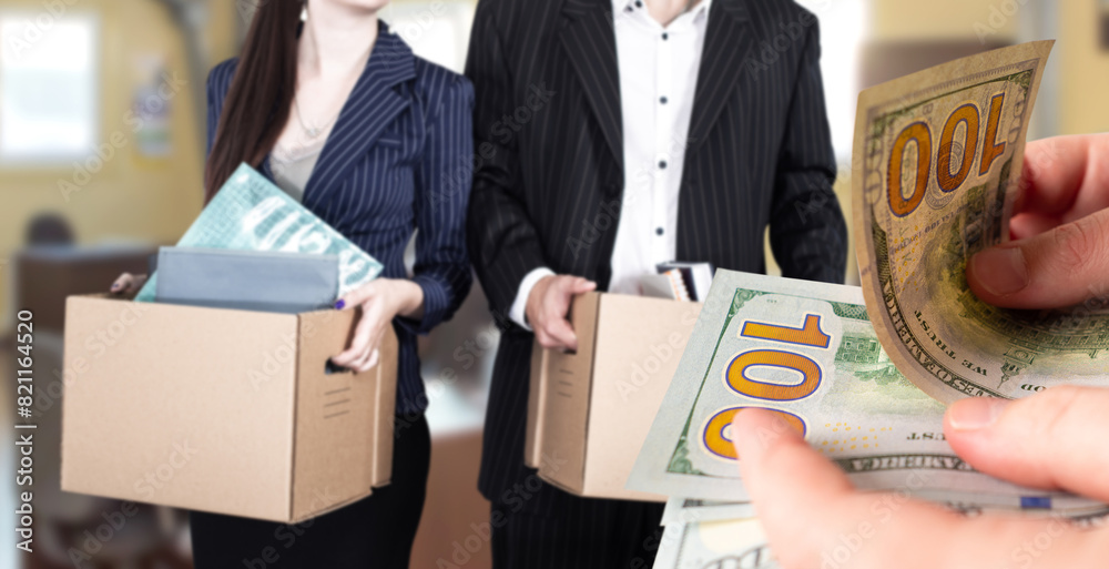 Payment of compensation to dismissed employee. People with dismissal box. Money in hands of man. Compensation for staff reduction. Payment of damages for termination of employment contract