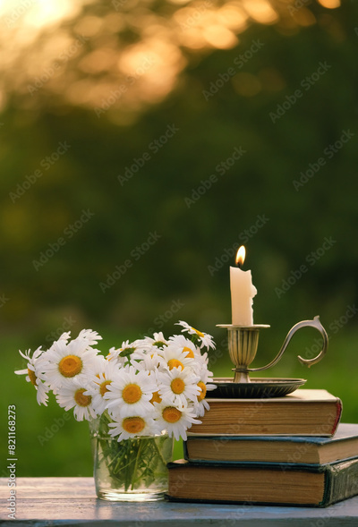 chamomile flowers, candlestick with burning candle and old books on table in garden. close up. relax, reading time. romantic inspiration composition.