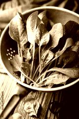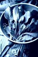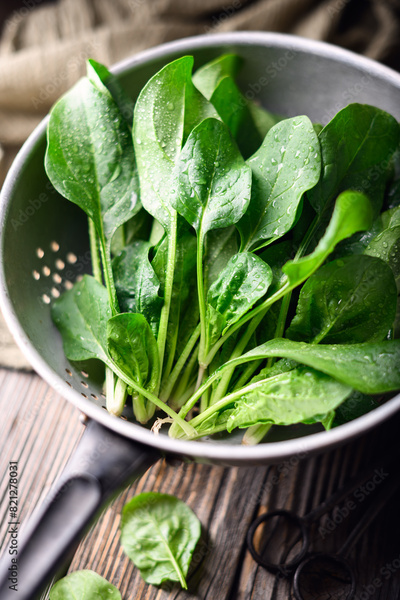Fresh green spinach leaves in a metal colander. Raw organic baby spinach heap close up