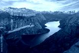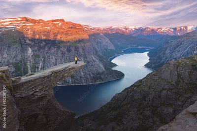 A tourist in a yellow jacket stands on the edge of the Troll's Tongue (Trolltunga) rock in Norway. Landscape photography