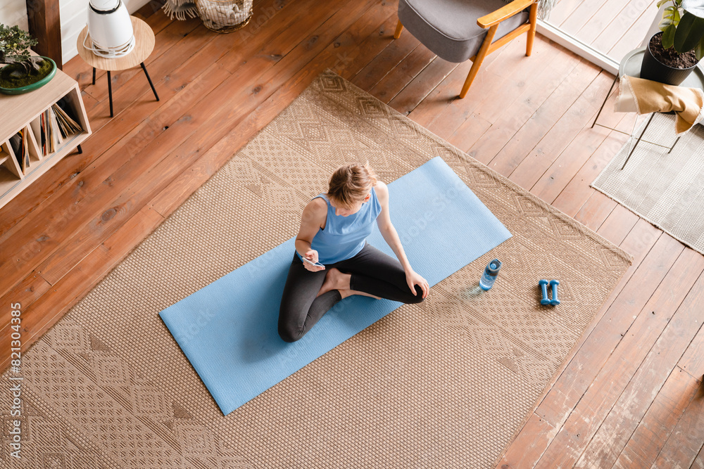 Top view photo of a young fit slim woman training at home for losing weight and fit strong body, shaping exercises on fitness mat, checking sport tracking app during yoga