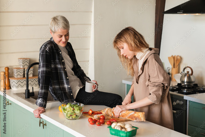 Two young girlfriends lesbians speaking and cooking together in the kitchen. LGBT relationship and female friendship. Love and care, togetherness