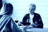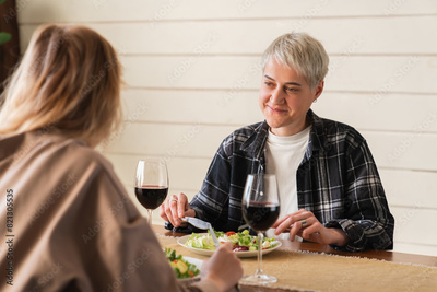 Romantic LGBT female couple talking on a date eating dinner drinking wine together. Love and relationship, lesbian care