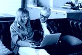 Caring relaxed lesbian couple two girlfriends sitting on a couch sofa watching movie film webinar e-learning on laptop online together on lockdown. LGBT relationship between two girls. Social distance