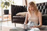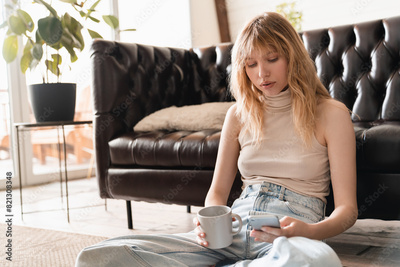 Peaceful caucasian young woman relaxing in her pastime reading emails on her smart phone, surfing the Internet, e-banking, uploading photos, loading feed online remotely
