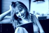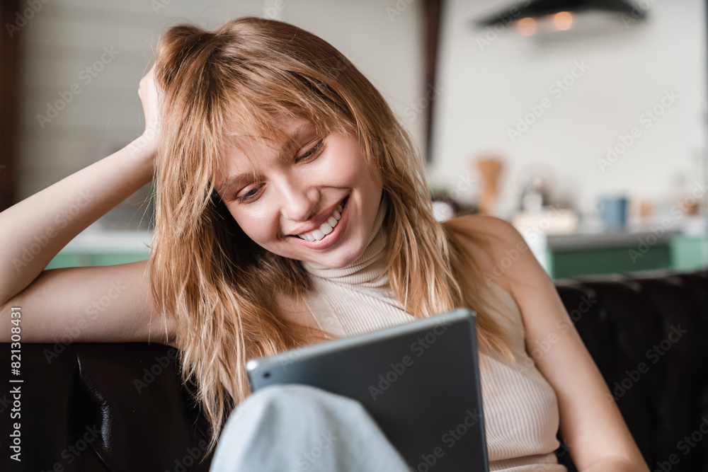 Young caucasian woman using digital tablet in the living room reading electronic book, checking emails online, surfing the Internet, doing online shopping, e-banking remotely on quarantine