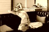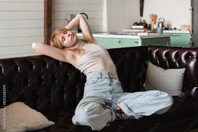 Stretching young caucasian female woman student exercising her back and neck after sedentary lifestyle, huge working studying load on the couch during lockdown