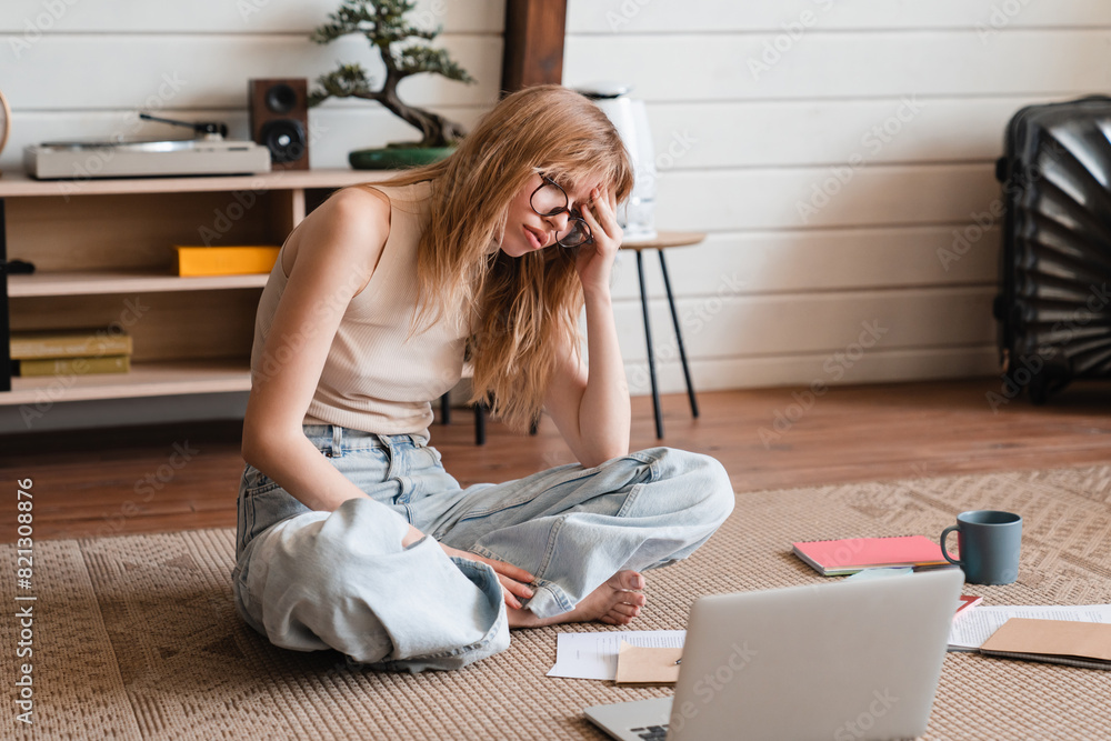 Tired after huge load stressful young student tutor freelancer businesswoman working with documents, preparing for exams in university college indoors, remote learning and working