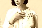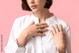 Beautiful young woman wearing stylish silver jewelry on pink background, closeup