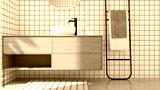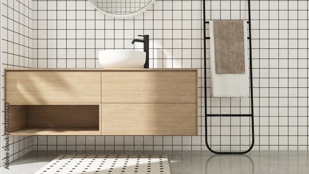 Wooden brown bathroom vanity counter, white washbasin, black faucet, mirror in sunlight on square tile wall, black grout for luxury beauty, cosmetic, skincare, toiletries product background 3D