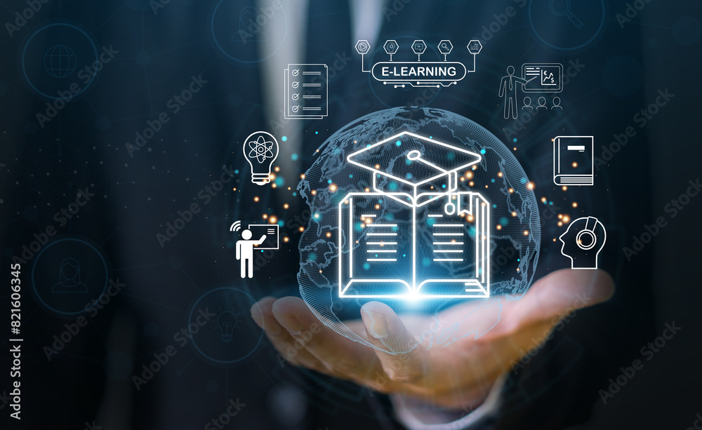 Human with technology internet learning and study online class webinar technology, e-learning, online education, education, training, tutor, video lesson, course, knowledge in homeschool.