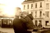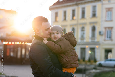 A happy father and three year old son hug in a city street. Warm relationships between parents and children. Spending time together. portrait