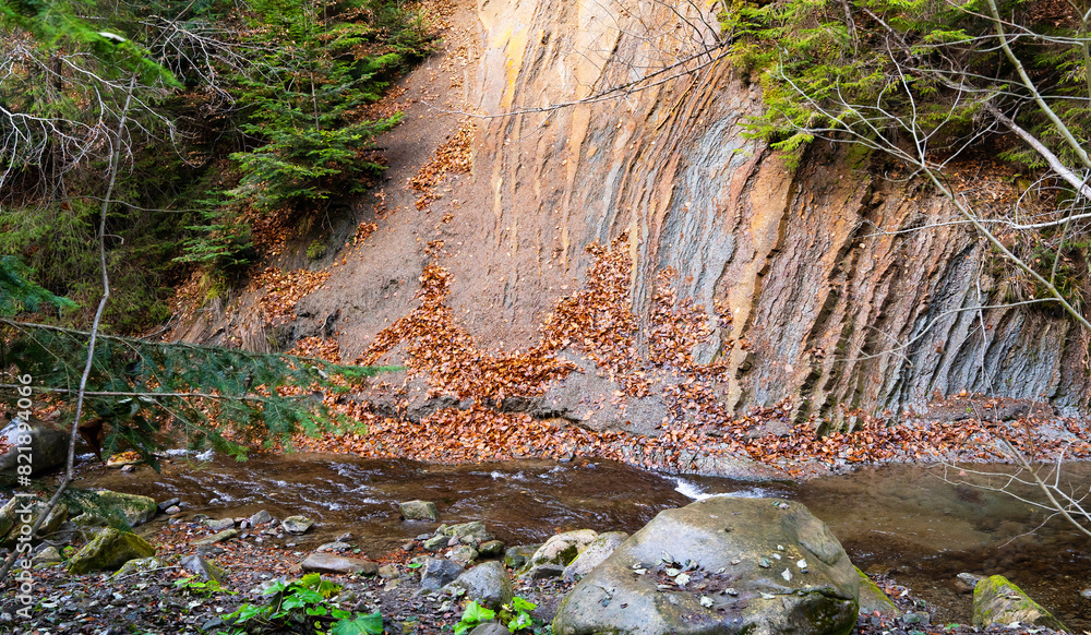 A wall made of exposed rock in the autumn forest of the Ukrainian Carpathians. Mountain river. Ancients layers of cooled down magma, beautiful patterns of natural untreated stone. Selective focus