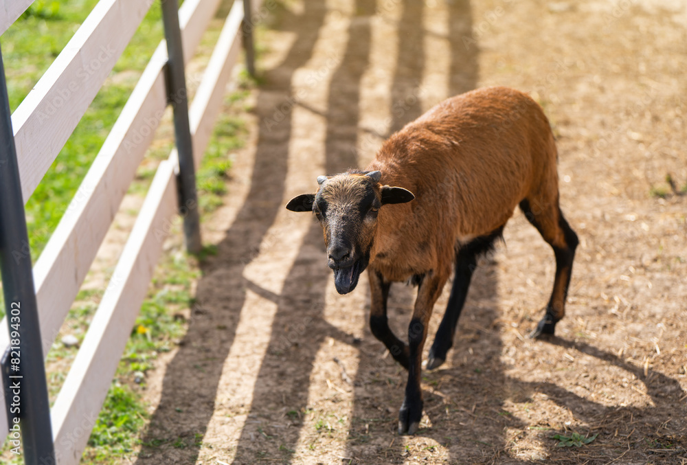Cameroon sheep is grazing in paddock or zoo cage. Animal concept