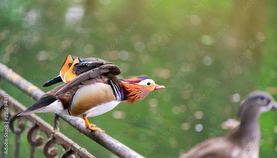 A beautiful male mandarin duck stands on a fence near the lake. Close-up photo. Nature and wild birds
