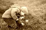 A three year old Caucasian toddler boy collects a bouquet of white dandelions in a field on a spring day. Nature and childhood concept