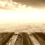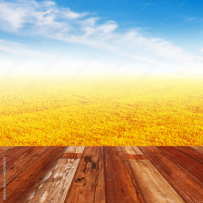 Perspective wood floor against yellow grass field under nice clo