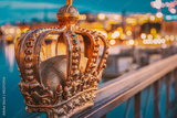 A majestic gold crown is elegantly placed on a wooden railing overlooking a beautiful body of water, enhancing the urban landscape with a touch of royalty