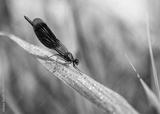Ważka Świtezianka błyszcząca na łące w porannej rosie.