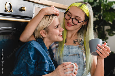 Happy romantic lgbtq lesbian couple females cuddling hugging kissing while drinking tea coffee having breakfast together at home kitchen. Love and relationship concept