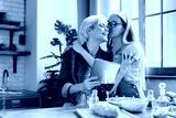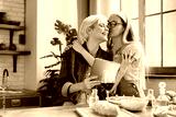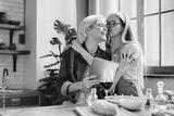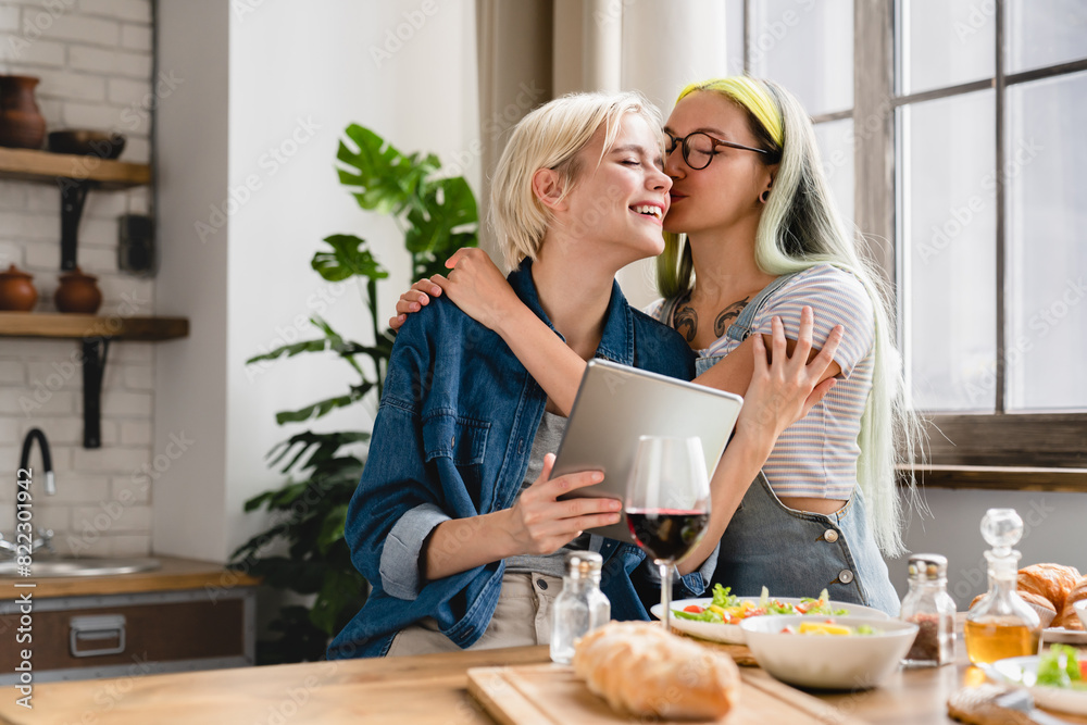 Caucasian young diverse couple lgbtq lesbians girlfriends cuddling hugging kissing while having breakfast together at home kitchen, doing e-shopping on digital tablet online at home
