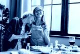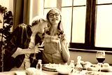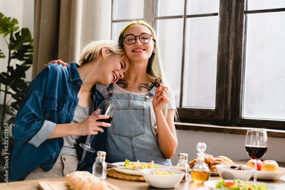 Young passionate loving lesbian lgbtq couple spending time together at home kitchen drinking wine, having fun, laughing during romantic date dinner