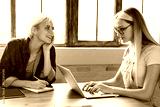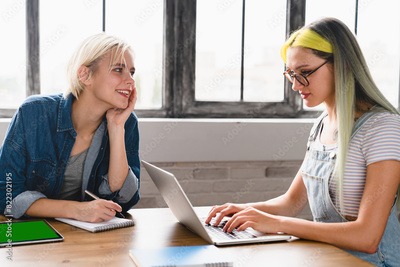 Young caucasian females lesbian lgbtq couple working together, doing homework, preparing for college university using laptop. Female colleagues falling in love.