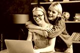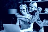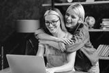 Homosexual couple girlfriends lgbtq lesbians sisters co-workers working together, studying, doing project, collective team work while hugging cuddling bonding in home office