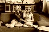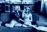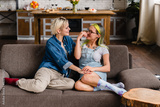 Happy romantic young lgbtq lesbian couple girlfriends hugging cuddling kissing showing love and care at home, sitting relaxing resting on the sofa. Togetherness concept