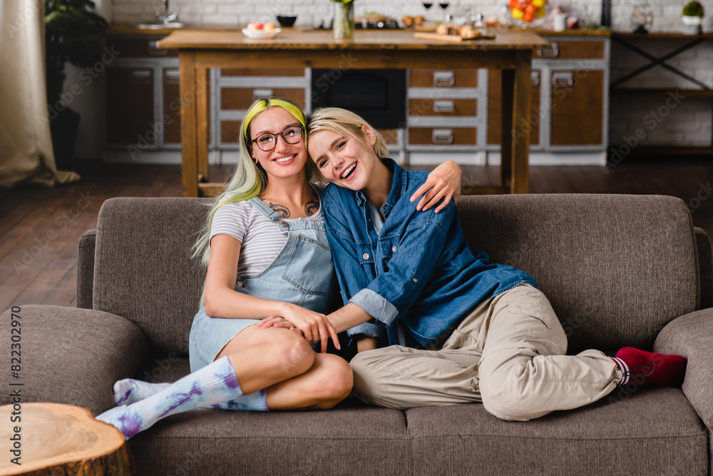 Lgbtq relationship.Happy romantic young lesbian couple girlfriends hugging cuddling kissing showing love and care at home, sitting relaxing resting on the sofa. Togetherness concept
