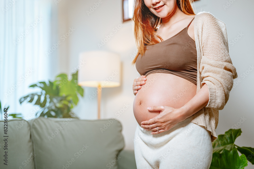 birth, motherhood, child, pregnant, parenting, prenatal, parenthood, pregnancy, mother, life. A woman is pregnant and is holding her stomach. She is wearing a brown top and white pants.
