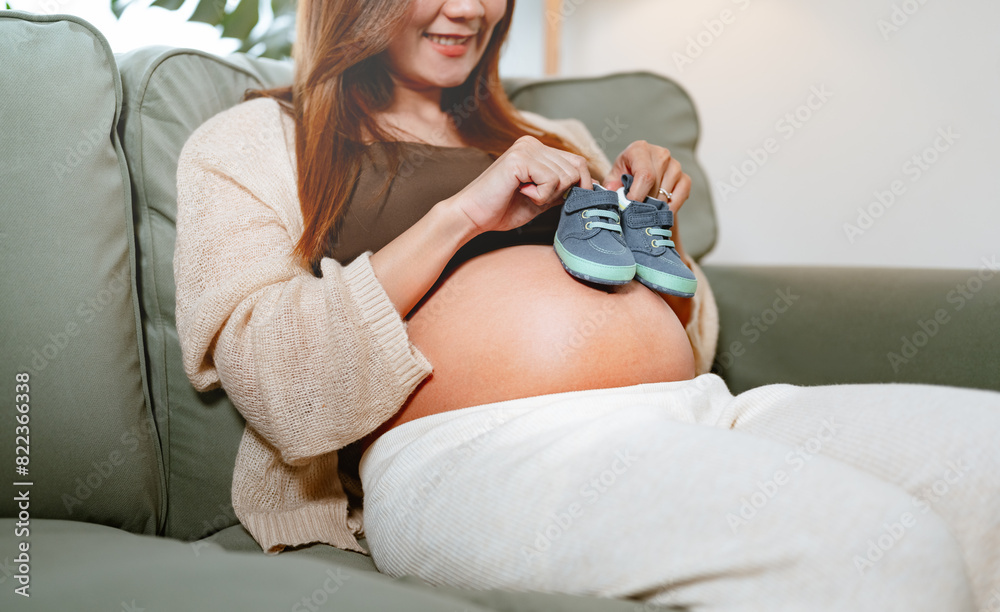 parenthood, pregnancy, abdomen, motherhood, child, pregnant, footwear, health, healthy, birth. A pregnant woman is holding a pair of baby shoes in her hands for the upcoming arrival of the baby.