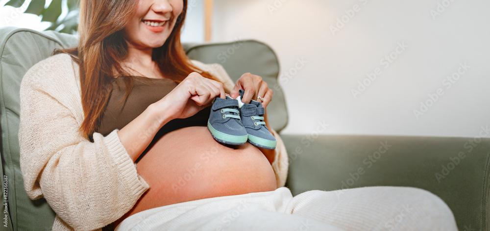 parenthood, pregnancy, abdomen, motherhood, child, pregnant, footwear, health, healthy, birth. A pregnant woman is holding a pair of baby shoes in her hands for the upcoming arrival of the baby.
