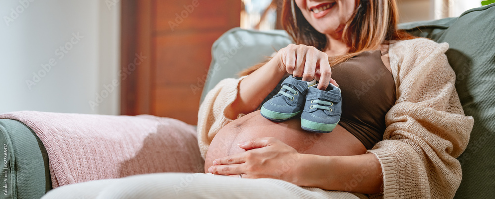 parenthood, mother, happiness, pregnancy, motherhood, maternity, pregnant, parent, footwear, abdomen. A woman is holding a pair of baby shoes in her hands for the upcoming arrival of the baby.