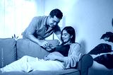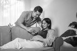 parenthood, pregnancy, motherhood, female, pregnant, father, hugging, parent, husband, together. A man and woman are sitting on couch, with the woman is pregnant. The man is holding baby boot in hand.