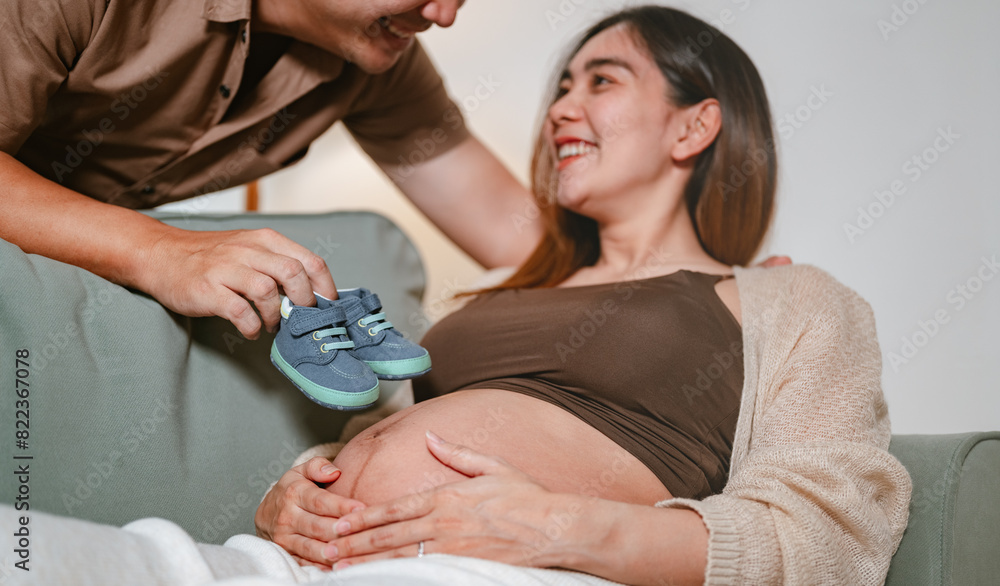 pregnancy, motherhood, maternity, pregnant, birth, husband, parent, parenthood, together, father. A man is holding a baby shoe in front of a pregnant woman and the man is looking at her.
