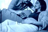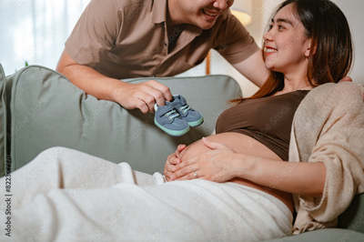 pregnancy, motherhood, childhood, pregnant, birth, ethnicity, parent, mother, father, baby. A pregnant woman is laying on a couch with a man holding a baby boot in her hand. Scene is warm and loving.
