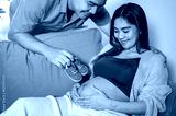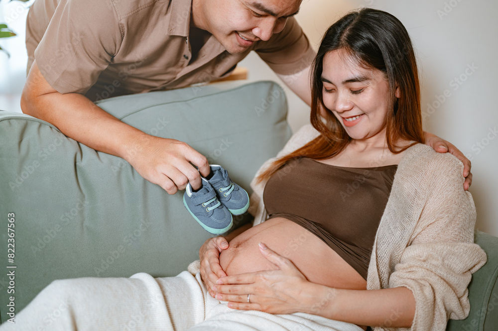 pregnancy, motherhood, childhood, pregnant, birth, ethnicity, parent, mother, father, baby. A pregnant woman is laying on a couch with a man holding a baby boot in her hand. Scene is warm and loving.