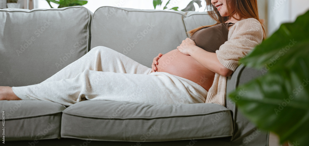parenthood, pregnancy, motherhood, childhood, pregnant, parent, childbirth, mother, birth, mom. A woman is sitting on a couch with a baby bump. She is smiling and she is happy.