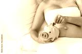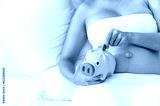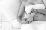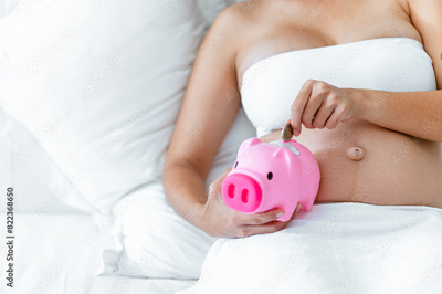 wealth, fund, earning, safe, savings, income, care, safety, piggybank, insurance. A woman is laying on a bed with a piggy bank in front of her. She is putting coins into the piggy bank.