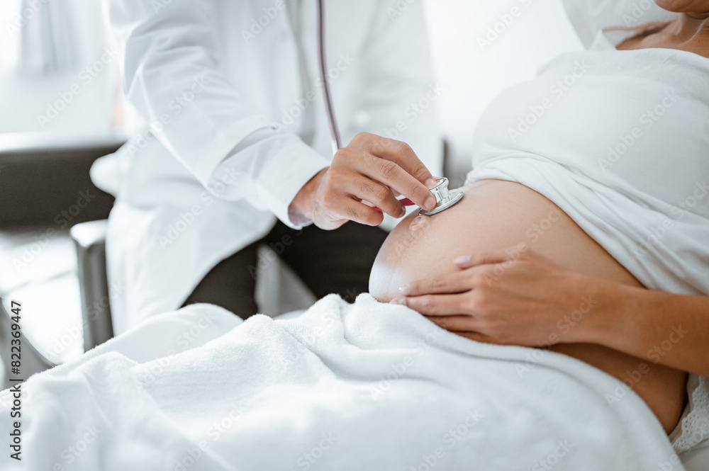 stethoscope, pregnancy, motherhood, pregnant, childbirth, healthcare, patient, heartbeat, hospital, mother. A doctor is examining a pregnant woman. The doctor to listen to the baby's heartbeat.