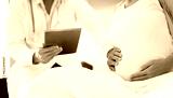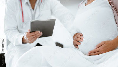 pregnancy, patient, caucasian, pregnant, mother, clinical, healthcare, hospital, stethoscope, abdomen. A doctor is showing a pregnant woman a tablet. The woman is sitting on a bed.