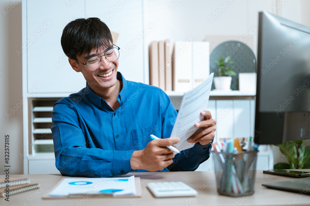 document, job, manager, news, notice, paperwork, result, success, successful, working. A man is sitting with a computer monitor and a piece of paper in front of him. He is smiling and holding a pen.