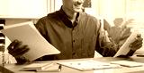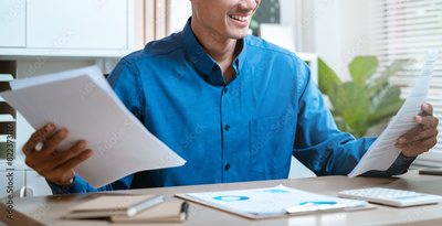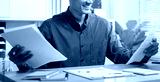 document, project, designer, creativity, job, manager, occupation, paperwork, statement, working. A man is sitting with papers in his hands. possibly with a serious or focused expression.