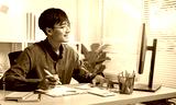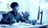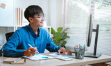 office, project, designer, job, learning, freelancer, manager, concentration, occupation, working. A man is sitting at a desk with a computer monitor and a stack of papers. He is smiling and happy.